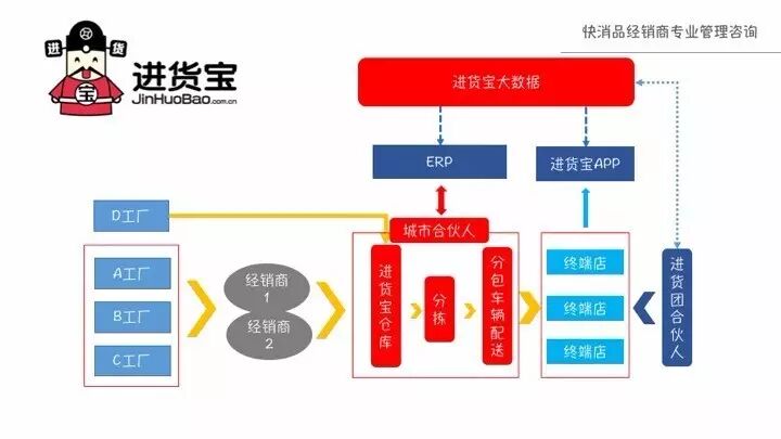 进货宝将处于商品流通环节上游的厂商或大经销商与处于流通环节末端的零售终端直接关连,通过去中间化实现降低双方成本,并通过平台两大核心能力和胆大生态体系为商家和品牌商提供相应服务。两大核心能力包括:大数据和品牌。大数据包括精细化运营(周转率为7天)、大数据能力(大数据分析、用户大数据、支付大数据)、数据商业模型(数据化销售渠道管理模型);品牌包括:自有品牌开发、新兴品牌战略、良性产品组合。三大生态体系包括:智能物流生态、互联网金融生态、软件服务生态。其中智能物流生态包括:分仓管理、统一配送和智能仓储系统;互联网金融生态包括:供应链金融和消费金融;软件服务生态包括:进货管家狗(ERP)、进货泡泡(CRM)、“赫尔墨斯”销售营销预测模型。