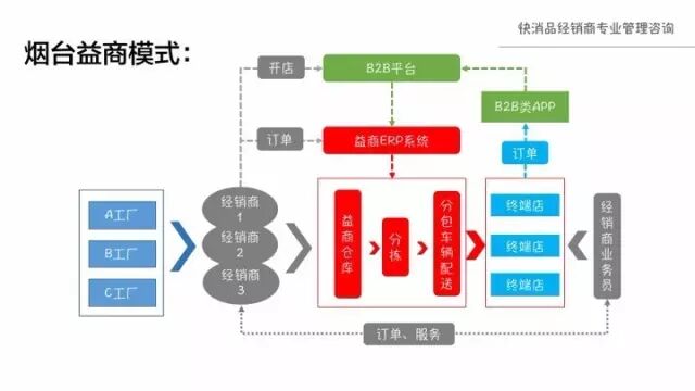 烟台益商公司的前身是烟台宗信食品,是由原有的国有企业改制过来的商贸公司,2001年开始,其推出商贸公司代理领域,专心做经销商物流配送,国内唯一“快消品”仓配管理系统 ERP 3.0、2015年业务量60亿,目前覆盖烟台市6000便利店,仓库面积7万平米,是国内唯一成功运营的“益商模式”,其模式能够为经销商节约70%的物流成本,目前计划在5年内在600城市建立城市共同配送体系,可与阿里、京东抗衡的B2B平台。