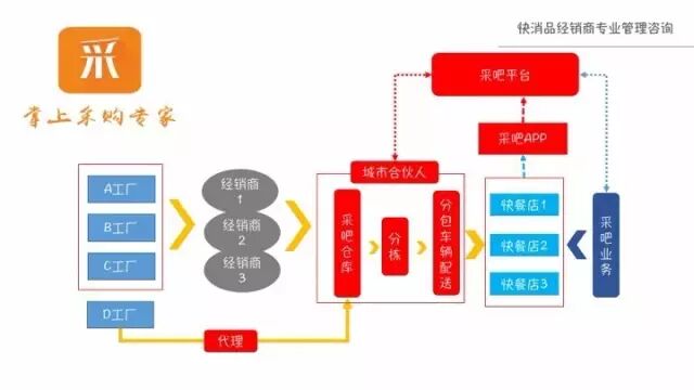 采吧采取与经销商联合重资产运营,自有仓储物流,自采货(一部分代理,一部分从当地代理商拿货),专为济南的中小餐饮渠道提供一次性餐具,粮油,调味品、饮料及酒水配送;为了满足广大中小餐饮店对时间上的的需求,只要当天晚上23点前订单,他们均可以保证第二天上午10点前准时配送完毕。目前已经在全国十几个省地级市开始启动。