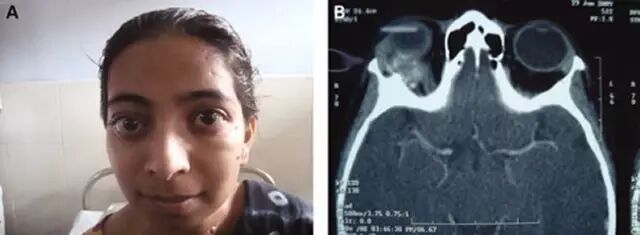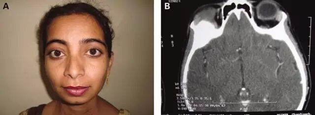 图1 (A)临床图片示右眼球突出。(B)眼眶CT扫描显示囊性纤维性骨炎。