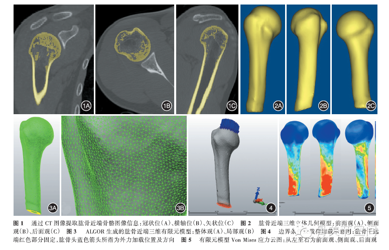 肱骨近端骨折占所有骨折的l0%,在老年人群中是第3常见的骨折,也是引起肩痛和肩关节功能障碍的主要原因。肱骨近端骨折目前仍是临床治疗的难点,选择合理治疗方案可以有效改善临床预后,切开复位锁定钢板内固定是较常用的手术方法,Gardner等回顾性分析临床锁定钢板治疗肱骨近端骨折的患者资料,强调了肱骨内侧柱完整的重要性,并推荐在较上方置入斜行锁定肱骨距螺钉。因此进一步了解肱骨近端生物力学特性、尤其是肱骨距在肱骨近端骨折中作用,将有助于增加对肱骨近端骨折的了解,从而为内固定治疗方案的最优化提供理论依据。Brekelmans等早在1972年首次将有限元方法应用于骨科生物力学的研究,近年来,该方法在骨科领域得到了广泛应用。以往建立有限元模型耗时费力,本文采用医学建模软件Mimics 17.0及有限元分析软件ALGOR快速建立肱骨近端三维有限元模型,方模拟生理状态下肱骨近端的受力情况以进行生物力学分析,观察应力分布特征,分析肱骨距负重特点,旨在指导临床内固定治疗方案的制定,并为肱骨近端髓内钉的设计、肩关节置换假体的设计、肩袖损伤修复等生物力学分析奠定基础。