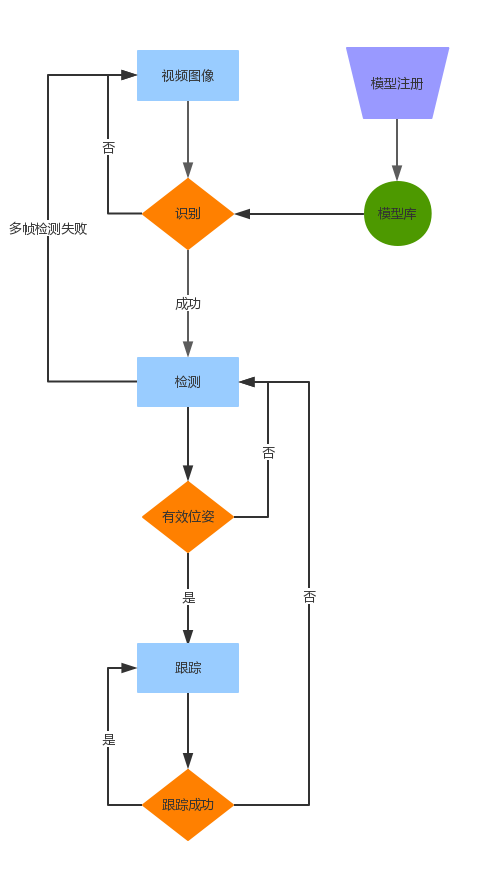 在检测过程中,拍摄视频画面,检测图像的自然特征,将当前视频图像与指定模型的参考图像匹配,根据匹配结果,判断当前场景图像与模型图像是否相同。如果不相同,则继续识别过程。否则,进入到检测阶段。