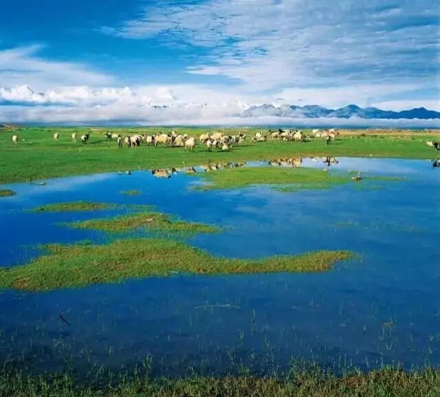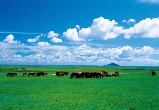 而草原上却碧波万顷,马、牛、羊群点缀其中。