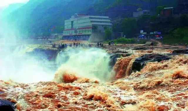 从照片中可以清楚地看到壶口瀑布靠陕西一侧的宾馆,
