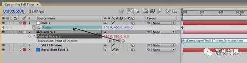创建一个虚拟层null,打开3D标签,按P,改变它的X Y Z的位置数值为-800,-600和-300 ,到第5秒,改变空的X,Y,Z位置为500,400和400。