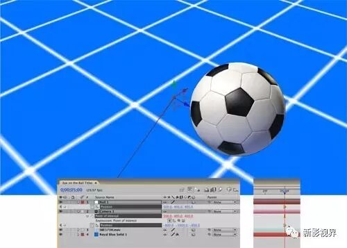 然后让我们使用摄象机做个动画,在时间轴0秒,选择摄像机1层,打P打开Position属性,并设置的X,Y,Z值2700,500,和-1000,5秒的位置,改变数值为-800,-600和-300 。预览一下,是不是很酷,只是有点假,球总是死死的在屏幕中心。