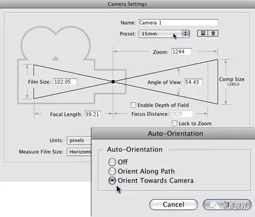 添加摄象机,让摄象机来当我们的眼睛,看看会否有什么变化。图层>新建>摄象机。从“预设”菜单中选择35毫米,确保现场复选框启用深度关闭,然后单击确定 。窍门出现了,一定要注意这里:选择时间轴上的球图层,然后到图层>变换>自动朝向( Layer>Transform>Auto-Orient),选择第3项确定。