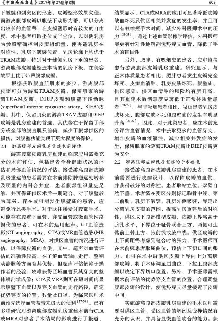 游离腹部皮瓣重建的临床应用需要充分的术前评估,包括患者全身健康状况的评估和局部血管情况的评估。接受游离腹部皮瓣重建的患者需要在术前排除肿瘤远处转移及明显的内科合并症,患者腹部组织量应足够,并可保证供区术后一期缝合。对于腹壁较为薄弱,存在或可能发生腹壁疝的患者,应避免行此类手术。对于既往接受过腹部手术,可能存在腹壁下血管、穿支血管或微血管网络损伤的患者,可在术前运用超声、CT血管造影(CTA)或MR血管造影(MRA),对供区血管的情况进行评估,以保障皮瓣的血供。其中,超声对血管评估的准确性较高,在了解血管轴向走行、鉴别动静脉等方面有其优势,但超声评估依赖于操作者的经验,较难获得区域血管及其穿支的整体解剖学成像;CTA及MRA则可在短时间内显示腹壁下血管以及穿支血管的走行路径,确定优势穿支的位置、数量及口径,为临床医师术前预先选择血管蒂带来极大的便利【17-20】。已有多项研究对游离腹部皮瓣重建术前行CTA或MRA对患者手术结局的影响进行了报道,结果显示,CTA或MRA的应用可显著降低皮瓣缺血坏死及供区相关并发症的发生率,并且可以有效缩短手术时间,减少外科医师术中的压力【21-23】。通过上述血管影像学评估,外科医师能更有针对性地解剖优势穿支血管,降低了手术的盲目性。