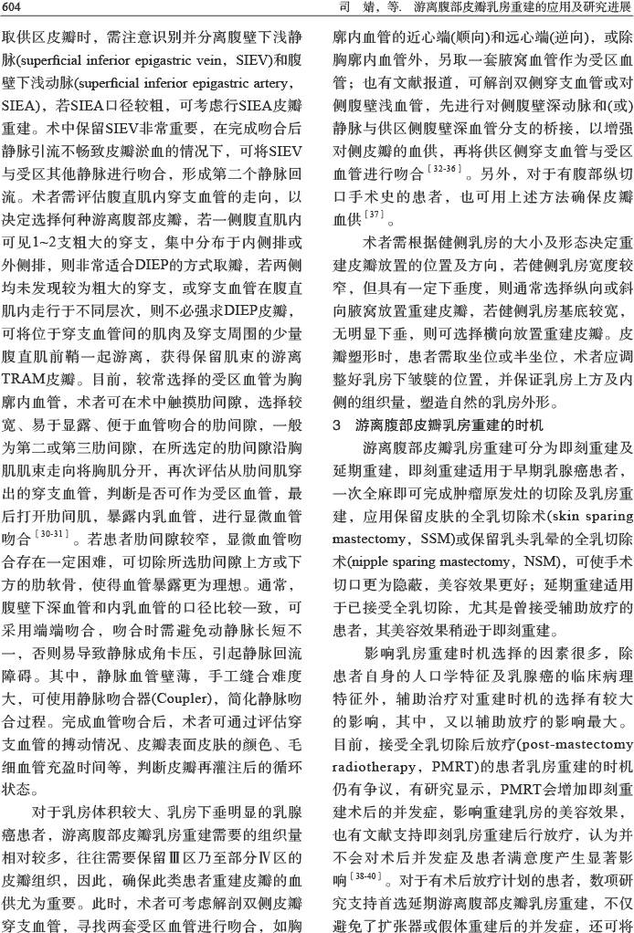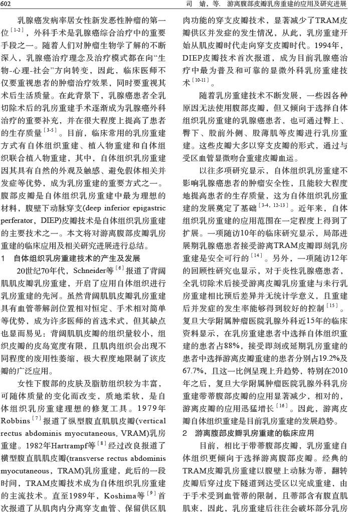 乳腺癌发病率居女性新发恶性肿瘤的第一位【1-2】,外科手术是乳腺癌综合治疗中的重要手段之一。随着人们对肿瘤生物学了解的不断深入,乳腺癌治疗理念及治疗模式都在向“生物-心理-社会”方向转变,因此,临床医师不仅要重视患者的肿瘤治疗效果,同时要重视其术后生活质量。在此背景下,乳腺癌患者全乳切除术后的重建手术逐渐成为乳腺癌外科治疗的重要补充,并在很大程度上提高了患者的生存质量【3-5】。目前,临床常用的重建方式有自体组织重建、植入物重建和自体组织联合植入物重建,其中,自体组织重建因其具有自然的外观及触感、避免假体相关并发症等优势,成为重建的重要方式之一。腹部皮瓣是自体组织重建中最为理想的材料,腹壁下动脉穿支(DIEP)皮瓣技术是自体组织重建的主要技术之一。本文将对游离腹部皮瓣重建的临床应用及相关研究进展进行总结。
