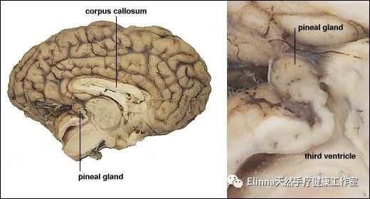位于脑部的前叶顶部,因外形酷似树的球果而得名。对于这个小小腺体功能的认识最具有神秘的色彩。是17世纪时被法国人Descartes提出,一度被奉为人类的是灵魂所在的位置,又曾被称为动物的“第三只眼”。50年代,Lerner及其同伴们从牛的松果腺中分离并鉴定出褪黑素(Melatonin,松果腺的主要激素,被称为“表达黑暗的化学信号”),由此开创了松果腺功能研究的新纪元。松果腺通过分泌褪黑素的昼夜节律把光照信息转化为化学信号:褪黑素。褪黑素是生物体与自然界环境同步的重要环节。今日的研究表明松果腺借着分泌褪黑激素,调节许多内分泌的节律。褪黑素与生物体的生长、发育、成熟和衰老过程密切相关,并对神经内分泌系统和免疫系统具有重要的调节作用。褪黑激素的分泌在黑暗时分泌量最高,而在白昼时分泌量低。