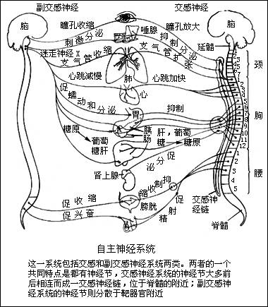 自主神经系统分为交感神经系统和副交感神经系统,交感和副交感神经在胸腔、腹腔和骨盆腔及头颈部构成神经丛和神经节。交感神经节位于脊柱附近,位于脊柱两侧的连接成左右交感神经干。副交感神经节自脑干和脊髓荐段发出。一般来说,交感神经系统引起兴奋活动,副交感神经系统引起抑制活动,二者对内脏器官的作用相反,配合调节,使内脏功能稳定有效。