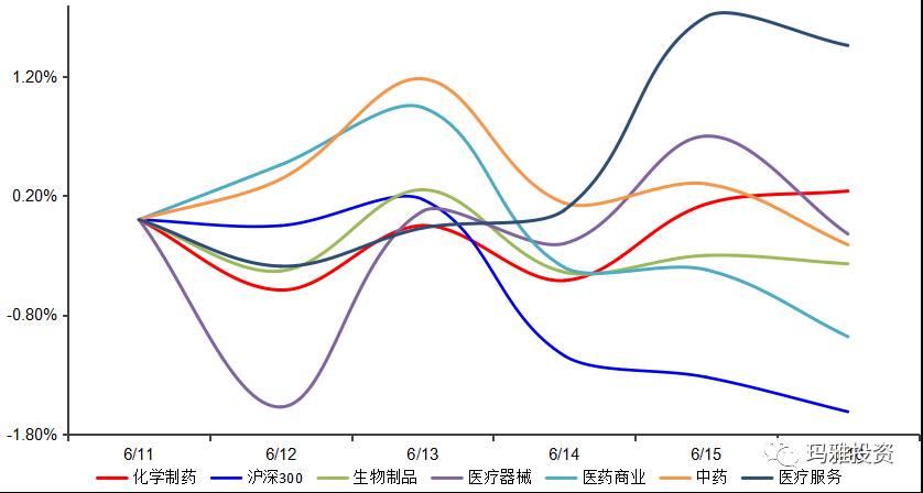医药子行业中全部跑赢沪深 300 指数;其中中医疗服务涨幅最大,上涨 1.46%。
