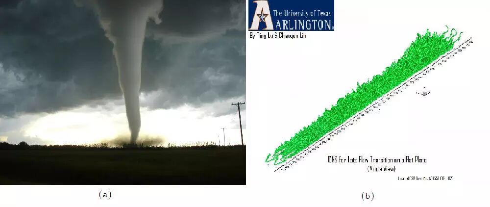 图1 自然界中的漩涡(a)龙卷风(b)边界层转捩