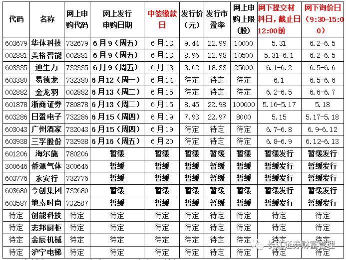 1、华体科技(申购代码732679):拟发行2500万股,2017年6月9日网上申购,网上申购上限10000股。
