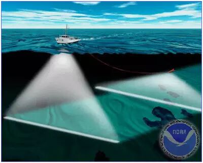 ②侧扫声纳:是基于回声探测原理进行水下目标探测的,通过系统的换能器基阵以一定的倾斜角度、发射频率、向海底发射具有指向性的宽垂直波束角和窄水平波束角的脉冲超声波,在触及海底目标后发生反射和散射,利用显示器上显示各表层图像的不同特征,经过图像判读,判别其海底目标特征,用于出露于海床面以上的海底目标探测。侧扫声呐配备有计算机图像处理甚至识别系统,可以分析海底目标的大小、形状、深度等,具有较高的分辨率。但由于侧扫声呐只能对波束空间进行粗略定向,因此对于海底目标深度不能精确测定,详细精确探测还得借助于潜水员潜摸、单波束测深仪探测、多波束测深设备扫海等其他办法辅助。