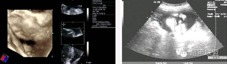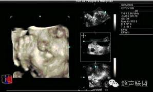 双侧发生时,鼻唇之间结构紊乱,上唇不清,鼻下方有不规则团块且明显前突。对于完全唇裂伴牙槽突裂或完全腭裂,三维超声表面成像仍存在一定局限性,因难以区分构成图像的结构是软组织还是骨质,此外,鼻部塌陷时易与缺损的颌部形成重叠像,加之受限制条件更多。所以,三维超声不能代替二维超声检查,在一定程度上起到补充完善作用。