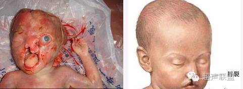 ( 4) 正中唇裂( 合并症型,显性易辨型) : 多为胎儿全前脑或中部面裂综合征的征象之一,主要表现为上唇中部、上腭中部较大范围缺失,前者眼距过近,后者眼距过远,鼻发育异常。