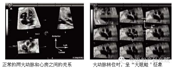 施景中教授在2008年首先描述了“大眼蛙”征象,用于诊断大动脉转位的特征性改变,采用该技术诊断大动脉转位,可以克服胎儿体位不理想的限制,同时降低对扫描手法的要求,使得大动脉转位的诊断变得非常容易。获得STIC数据后,测量心底大血管短轴平面二三尖瓣环连线和主肺动脉连线之间的夹角,正常时该夹角呈锐角(左下图);大动脉转位时,两条连线呈平行状态(右下图),主动脉、肺动脉呈左右排列,与左右房一起构成如“大眼蛙”形态图像。