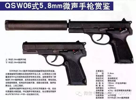 QSW06式5.8毫米是我军新一代列装武器,也是我国自行研制的第一种小口径,主要装备于我军侦察兵及其他特业人员,使用DCV05式5.8毫米微声弹(简称5.8毫米微声弹),以单发火力隐蔽杀伤50米距离内有单兵防护的有生目标。该枪采用半自由枪机式自动原理,惯性闭锁,击锤回转式击发,大容弹量双排双进弹匣供弹。