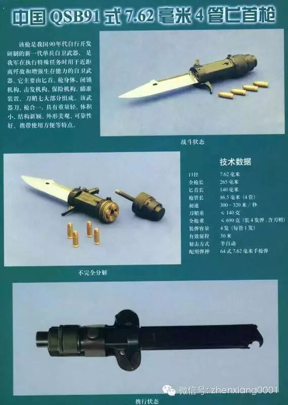 中国QSB91式匕首枪:该枪具有射程远、射弹杀伤威力大、精度高、故障率低、射击稳定性好等优点。其质量轻、结构简单、用途广泛、使用方便,兼有锯、锉、剪、刺、开罐头、开瓶盖等多种功能,在恶劣的环境中能较好地排除障碍,增强野战生存能力。匕首与刀鞘上的剪支座配合可剪断3mm以下的钢丝,其背部的锯锉和平锉可以对胶木、钢铁等较硬的物体进行锯、锉。该枪使用7.62mm手枪弹,在10m的距离上能击穿120mm厚的红松木板,是特种兵在敌后或是执行特殊任务时使用的一种自卫武器。