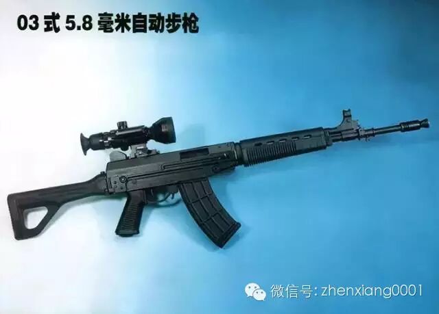 中国最新型QBZ03式5.8毫米自动:QBZ03式5.8mm自动可以单、连发发射,主要杀伤400m范围内暴露的有个人防护的生动目标;发射枪榴弹可以毁伤轻型装甲或杀伤集群生动目标;配有QNL95式刺刀,必要时也可用刺刀杀伤敌人;可配白光瞄准镜或微光瞄准镜。该枪既可作为特种兵、空降兵、装甲兵和普通部队的基本战斗武器,又可作为基层指挥人员和勤务人员的战斗自卫武器。