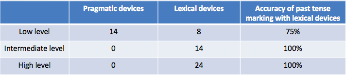 那在汉语中从不标记过去时的我们,在描述1-2分钟的发生过去的事件时该怎么标记过去式呢?根据Bardovi-Harlig (1999),假如第二语言学习者的母语没有曲折变化时,他们在学习英文过去式标记会经历几个发展阶段。在第一个阶段,第二语言学习者会采用一些语用手段来指示事件发生在过去,比如通过事情发生的先后顺序,日期和语境。在第二个阶段,第二语言学习者会通过词汇手段,主要是时间状语,来指示过去。到了第三个阶段,学习者会使用动词的曲折变化来指示过去,也就是我们所说的直接标记过去式(Schumann, 1987; Yang & Huang, 2004)。