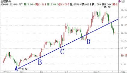 上升趋势线是在股价持续上涨的过程中,将每次的调整低点项链而形成的趋势线。如果股票运行的过程中每个后面的峰壑谷都高于前面的峰和谷,则趋势就是上升防线。这就是常说的一底比一底稿,或者底部抬高,此时应该画出上升趋势线。