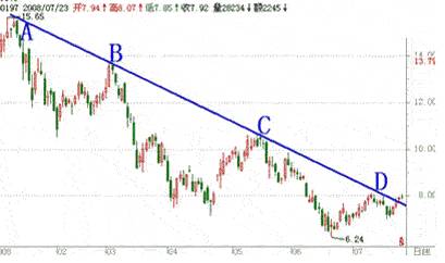 下降趋势线是在股价持续下跌过程中,将每次的反弹高点相连接而形成的趋势线。如果股票运行过程中每个后面的峰和谷都低于前面的峰和谷,则趋势就是下降方向。这就是常说的一顶比一顶低或者顶部降低、此时应该画出下降趋势线。