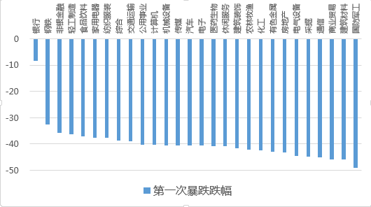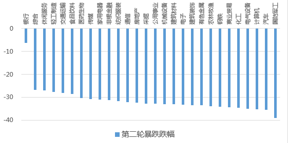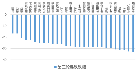 从行业上分析,三轮下跌各行业下跌情况分别如下: