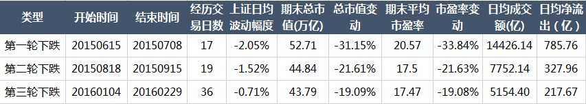 我们可以很清晰的看到:后一轮下跌的时间周期都在拉长,而下跌幅度在下降,市值和市盈率变动幅度在降低,两市日均成交额和日均净流出金额也在不断减少。根据上述趋势,可以推理判断,经过三轮暴跌后,后续即使再出现下跌走势,力度也将进一步减小,同时量能将会进一步萎缩,流出将会进一步减少。
