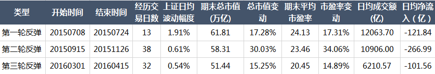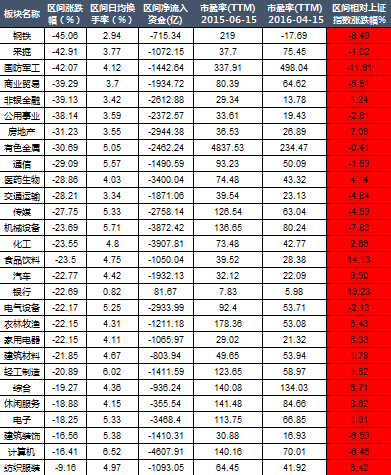 纵观股灾以来走势,从2015年6月15日第一轮暴跌开始,至2016年4月15日第三轮反弹结束,两市所有A股平均下跌25.2%,日均换手率4.85%,资金净流出高达5.5万亿,流通市值从56.04万亿减少到36.72万亿,减少达19.32万亿(-34.47%),整体市盈率(TTM)从31.09倍下降到20.45倍(-34.22%)。