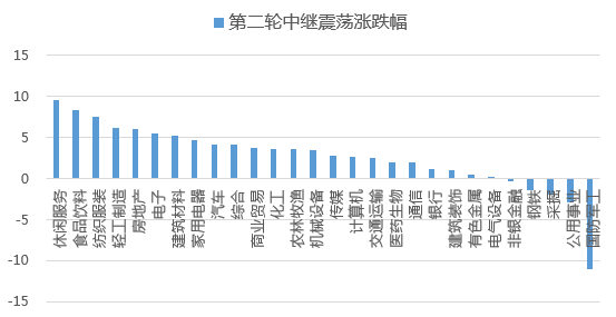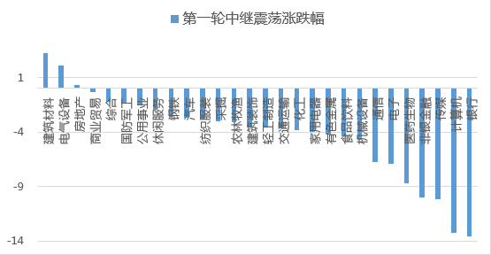从行业上分析,两轮中继震荡各行业涨跌情况分别如下:
