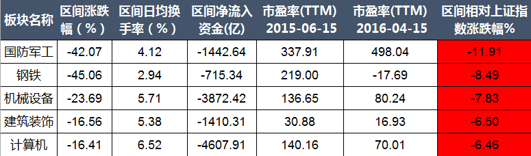 从行业分析,股灾以来,相比上证指数,流通市值加权平均跌幅最大的前五大行业分别为国防军工、钢铁、机械设备、建筑装饰和计算机,除建筑装饰行业外,股灾前其他行业平均市盈率均超过130倍:
