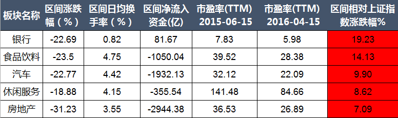 相比上证指数,流通市值加权平均涨幅最大的前五大行业分别为银行、食品饮料、汽车、休闲服务和房地产,除休闲服务业外,股灾前其他行业平均市盈率均低于40倍:
