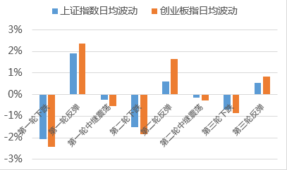 横向看,上证指数各阶段的日均波动幅度均小于创业板的波动幅度。
