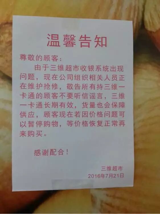 三维超市这两天究竟发生了什么?小编不得而知,而这标签上的价格与商品抢购,可是真真切切的在发生着...一边商品价格疯涨,一边市民们拿着一卡通在疯狂购物,好像花不完就要作废似的,这些异常现象,是不是在预示着什么呢?希望整件事就像三维超市所张贴的公告,是我们大家虚惊一场吧!!!