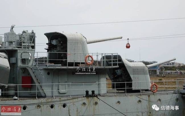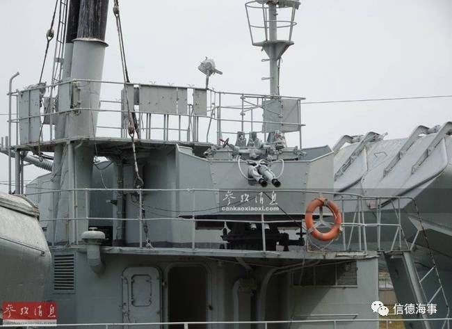 除上述武器外,在“太原舰”的舰艉还布置有2座432毫米反潜深弹发射炮,可发射62式深水炸弹,射程150米,用于反潜作战。在反潜深弹炮的后方还有布雷轨,最多可施放56枚锚雷。就当时的作战性能来说,“太原舰”是名副其实的“多面手”。图中舰艉还能看到难得一见的国徽,应是“四大金刚”才有的殊荣。