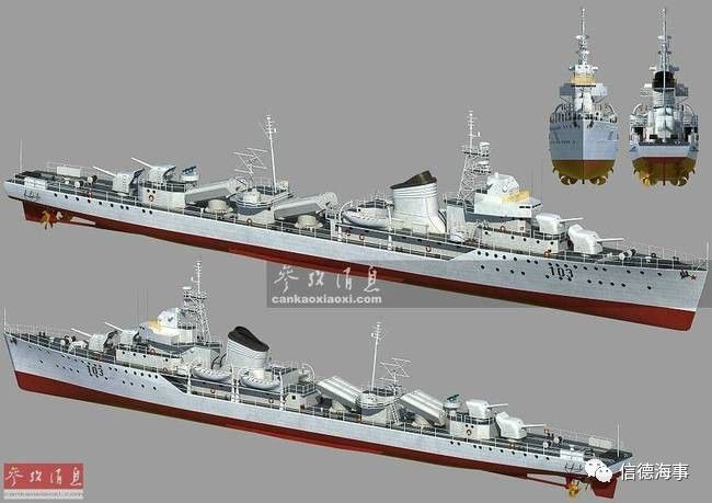 “太原舰”属鞍山级驱逐舰4号舰,鞍山级是20世纪50年代初,中国海军从苏联引进的4艘07型大型驱逐舰(首舰为“鞍山”号),也是中国海军装备的第一代大型驱逐舰。图为经过现代化改装后的“长春舰”(103)多角度CG图,