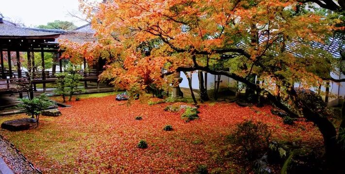 光明院是京都最大的禅寺,临济宗东福寺派的总院。连年战争及1881年的火灾,将其佛堂、法堂、厨房、住房一并烧毁,其后逐次重建。寺内的通天桥是观赏红叶的景区。卧云桥则是拍摄通天桥和洗玉涧红叶景观的最佳地点。1939年,重森三玲先生(著名造园专家)在院内建造了波心亭,将传统的石阵组合上升到艺术领域。通过白砂表现大海,青苔表现陆地,青苔下埋藏的小石块作为大海的波浪……成功打造了绘画型曲线,让人惊叹石头竟然有如此的美感。推荐红叶时节或五月前后来观赏。