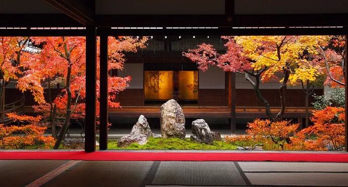 著名庭园设计师北山安夫先生主持了庭园的建造,北山先生擅长石头组合,能从一堆石块中快速决定每块石头的摆放位置,他设计的庭园达到了360度完美观赏性。坐在室内看庭寺内庭园,你会发现窗户或门框等自然而然地将外面的景色装进了画框里一般,犹如长谷川等伯的画作,眼前的一切变得更富有美感了。