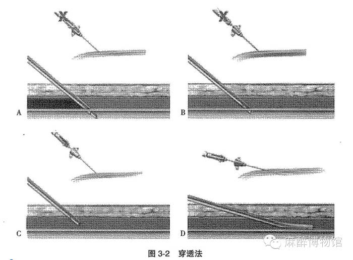 2.穿透法进针点、进针方向和角度同上。当见有回血时再向前推进5mm左右,然后撒出针芯,将套管缓慢后退,当出现喷血时停止退针,并立即将套管向前推进,送入时无阻力感且喷血,说明穿刺成功(图3-2)。![]()