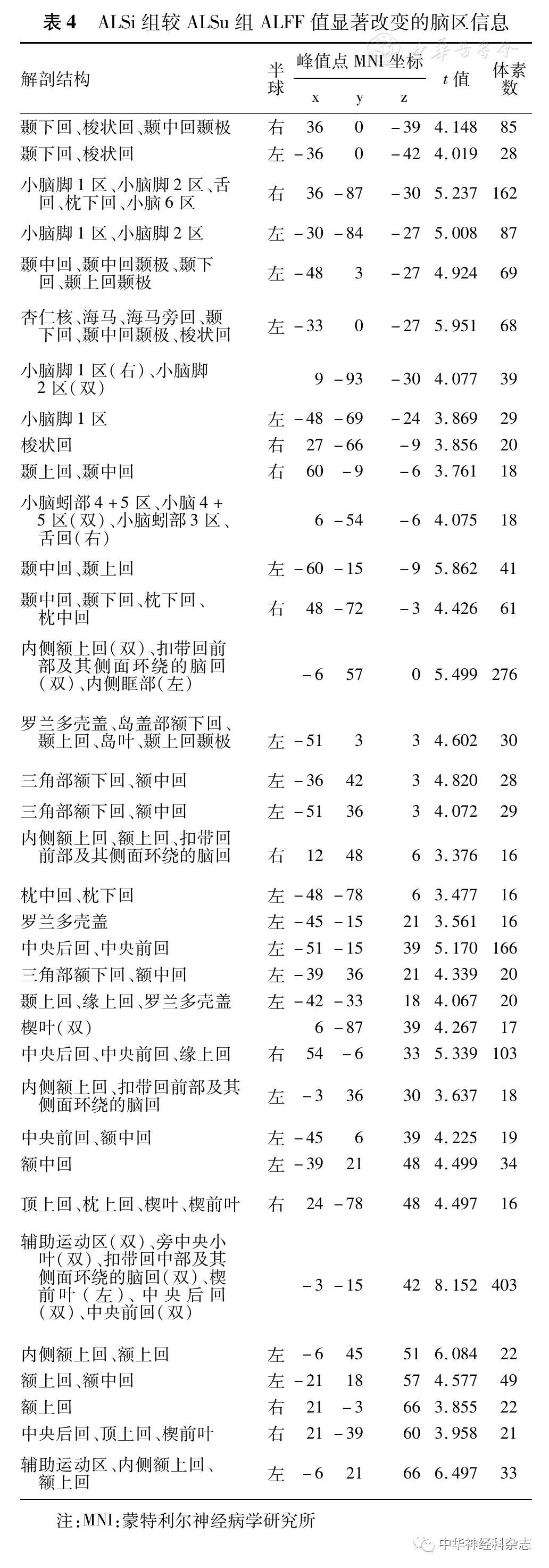 (1)图像预处理:使用MRIcron软件(http://www.cabiatl.com/mricro/mricron/dcm2nii.html)的dcm2nii程序将所有受试者的结构像和功能像由医学数字成像和通信标准(Digital Imaging and Communications in Medicine)格式转换为神经影像信息学技术方案(Neuroimaging Informatics Technology Initiative)格式。在MATLAB R2012a软件(http://cn.mathworks.com/products/matlab/)环境下使用SPM8软件(http://www.fil.ion.ucl.ac.uk/spm/)和DPARSFA2.3软件(http://restfmri.net/forum/index.php)[12]对图像进行预处理。(2)基于体素的形态学(VBM)分析:使用SPM和REST软件(http://restfmri.net/forum/index.php)[13],在全脑灰质/白质区域对ALSi组与ALSu组标准化后的灰质/白质密度像进行两样本t检验,经过AlphaSim多重比较校正(校正前单个体素阈值设为P<0.01,簇阈值设为16个相邻体素,则校正后阈值为P<0.05)后,获得组间灰质/白质密度差异的脑区。(3)ALFF分析:使用DPARSFA软件,根据预处理后的功能像计算各受试者的全脑ALFF图。使用SPM和REST软件,在全脑灰质区域对ALSi组与ALSu组的ALFF图进行双样本t检验,经过AlphaSim多重比较校正(校正前单个体素阈值设为P<0.01,簇阈值设为16个相邻体素,则校正后阈值为P<0.05)后,获得全脑ALFF值组间差异有统计学意义的脑区。