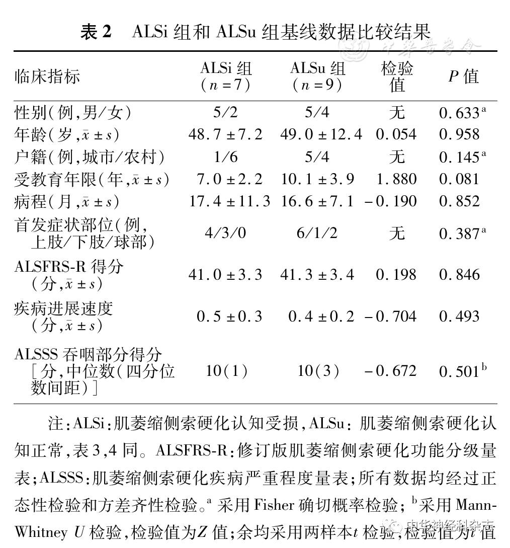 所有数据均经过正态性检验和方差齐性检验,正态分布的计量资料数据应用均数±标准差表示,计数资料数据应用例数表示,偏态资料数据应用中位数表示。采用两样本t检验比较两组受试者的年龄、受教育年限、病程、ALSFRS-R得分、疾病进展速度,采用Mann-Whitney U检验比较两组受试者的ALSSS吞咽部分得分,采用Fisher确切概率检验比较两组受试者的性别、户籍、首发症状部位。所有统计均使用IBM SPSS 19.0软件完成,设双侧P<0.05为差异存在统计学意义。