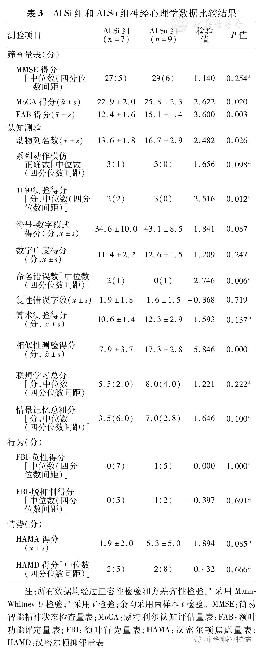 对所有受试者进行完整神经心理学评估,根据动物列名、系列动作模仿、画钟测验、符号-数字模式测验、临摹图形五项执行功能测验结果分组,其中存在≥2项结果异常(即低于均值1.64倍标准差,等价于同年龄同学历健康人第5百分位水平)者归入ALS认知受损(ALS with impaired cognition,ALSi)组[4],其余归入ALS认知正常(ALS with unimpaired cognition,ALSu)组。本研究为病例对照研究,获得北京协和医院医学伦理审查委员会批准,所有受试者均于检查前被详细告知研究目的及方法,自愿参加并签署知情同意书。