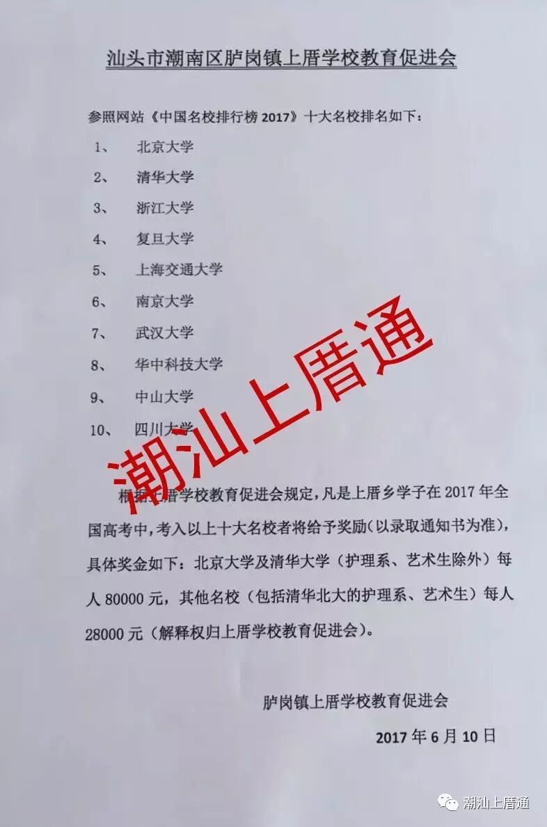 根据上厝学校教育促进会规定:凡是上厝乡学子在2017年全国高考中,考入以下十大名校者将给予奖励(已录取通知书为准),具体奖金如下:北京大学及清华大学(护理系,艺术生除外)每人80000元,其他名校(包括清华北大的护理系,艺术生)每人28000元(解释权归上厝学校教育促进会)