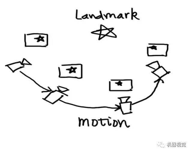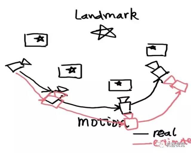 在这张图中,我们有一个路标点(五角星),并在各个关键帧中都看到了这个点。于是,我们就能用PnP或ICP求解相邻关键点的运动方向。这些在上篇文章都介绍过了,包括特征选择,匹配及计算等等。那么,这个过程中有什么问题呢?
