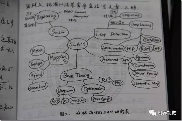 这个图是从我笔记本上拍下来的(请勿吐槽字和对焦)。可以看到,以SLAM为中心,有五个圈连接到它。我称它为Basic Theory(基础理论)、Sensor(传感器)、Mapping(建图)、Loop Detection(回环检测)、Advanced Topic(高级问题)。这可以说是SLAM的研究方向。下面我们"花开五朵,各表一枝"。
