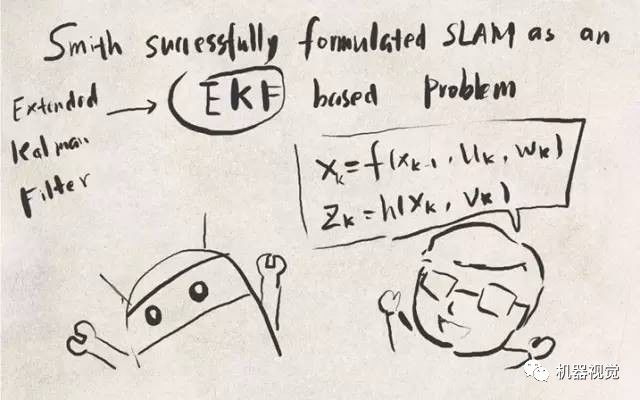 SLAM的基本理论,是指它的数学建模。也就是你如何用数学模型来表达这个问题。为什么说它"基本"呢?因为数学模型影响着整个系统的性能,决定了其他问题的处理方法。在早先的研究中(86年提出[1]至21世纪前期[2]),是使用卡尔曼滤波器的数学模型的。那里的机器人,就是一个位姿的时间序列;而地图,就是一堆路标点的集合。什么是路标点的集合?就是用(x,y,z)表示每一个路标,然后在滤波器更新的过程中,让这三个数慢慢收敛。