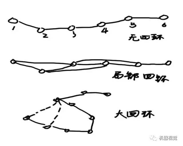 机器人的情形也差不多,除了大多数时候是人在遥控它行走。因而我们希望,机器人不要仅和它上一个帧进行比较,而是和更多先前的帧比较,找出其中的相似之处。这就是所谓的回环检测(Loop closure detection)。用下面的示意图来说明:
