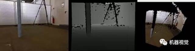 要打败敌人,首先要了解你的武器。不错,我们先介绍一下Kinect。众所周知这是一款深度相机,你或许还听说过别的牌子,但Kinect的价格便宜,测量范围在3m-12m之间,精度约3cm,较适合于小萝卜这样的室内机器人。它采到的图像是这个样子的(从左往右依次为rgb图,深度图与点云图):